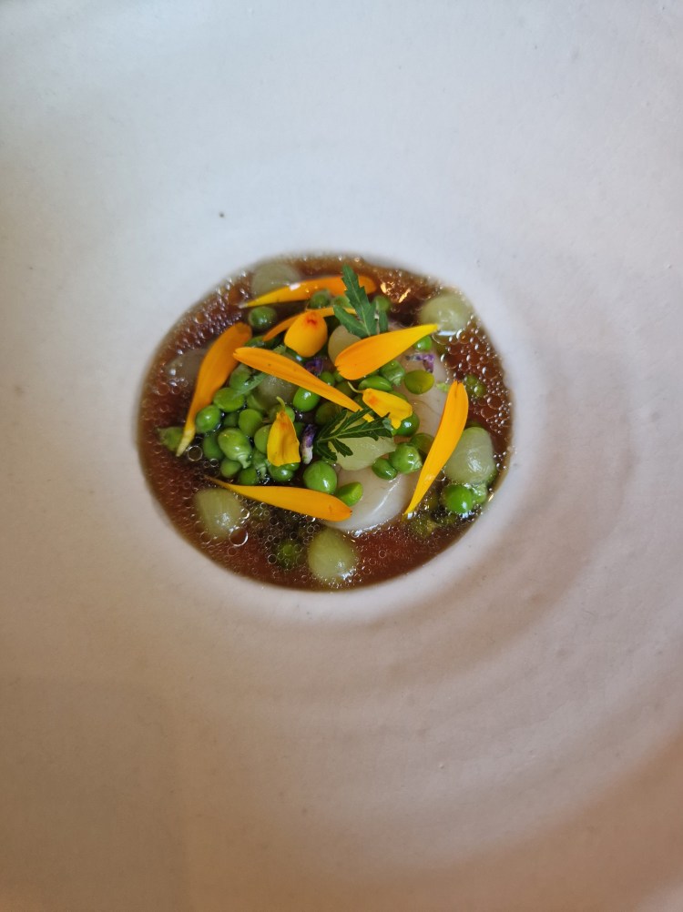 The first seafood course was scallops, pea and blackcurrant wood. Raw scallop, which this time was surprisingly ok. The peas popped in the mouth, a slight acidic taste overall but this helped hide the raw scallop.