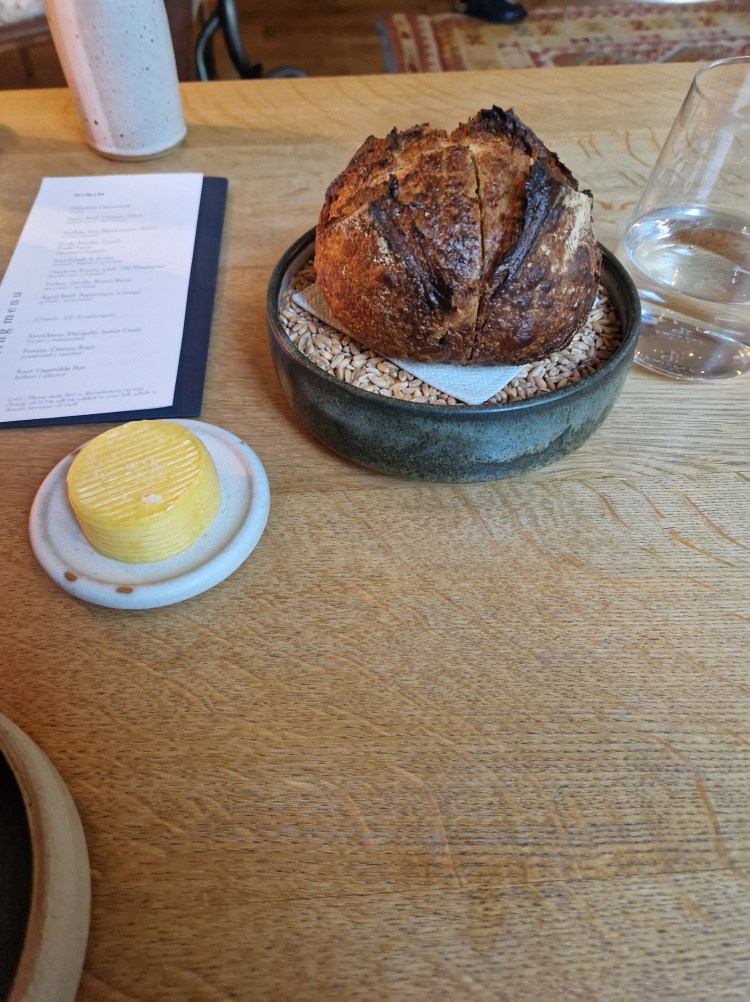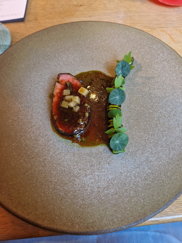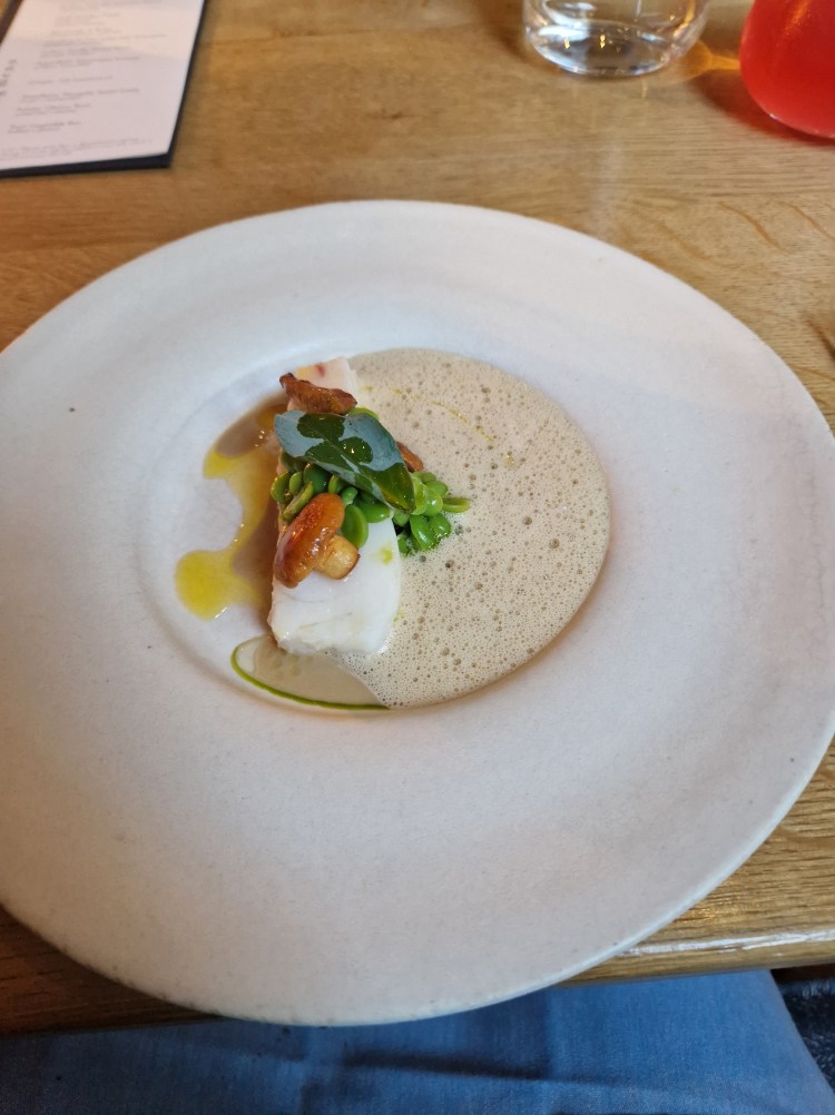 I was brought sourdough and butter, a lot of sourdough. I was also brought the next dish a few seconds later. Charlotte potatoes, leek and old Winchester cheese. I found it very odd that what looks to be two different courses on the menu, is actually one course, as the bread compliments the potatoes, or so I was told. If this is the case, then this needs to be shown as one dish on the menu and the sourdough needs to be a lot smaller. The potatoes were perfect round spheres coated in cheesy goodness… delicious. Once the potatoes were eaten and my dish sat empty, I began to make a dent in the bread, however, when I was three quarters of the way through the butter, I noticed what looked to be a fly in the butter, not moving. A blonde waitress with fairy earrings came over to top up my water and I pointed this out to her. She apologised and offered to get me fresh butter but I declined and so the bread was cleared. The same waitress came back a few moments later to clear my drink and replace it with a fresh one as she had noticed a fly in it. Great attention to detail with the drink, bad attention to detail on the kitchens part with the butter.