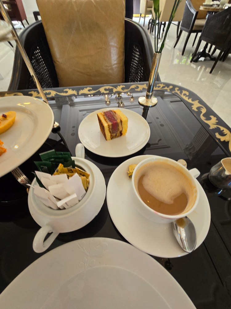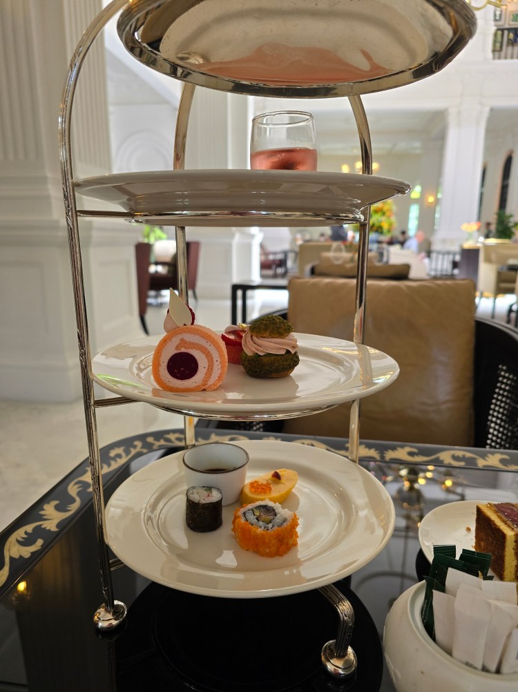 The end of my first week in Singapore ended with Afternoon Tea at the iconic Raffles Hotel. The theme for the Afternoon Tea, Sakura, in other words, Cherry Blossoms in Japan. The Hotel itself it as pristine and luxurious as you would expect. White walls and floors everywhere, a stool for my handbag so it wasn’t on the floor and Raffles Doormen in their distinct outfit. The food soon arrived sans scones. One sandwich on a plate, arrived with the cake stand, Beef with Katsu Béchamel. The bread was toasted, which I found a little odd but the beef was cooked perfectly and just the right amount of Béchamel. The bottom tier of the cake stand was Sushi; two different types of Sushi and a Tamagoyaki. Slightly disappointed no chopsticks were brought with the Sushi. After eating my yearly tolerance of Sushi in Tokyo, I must admit I was not looking forward to more Sushi, however, the 2 pieces were manageable. The Tamagoyaki was on the savoury side. Having made and eaten this in Tokyo, I know that there is a lot of sugar in this, this one didn’t seem to have seen sugar at all.