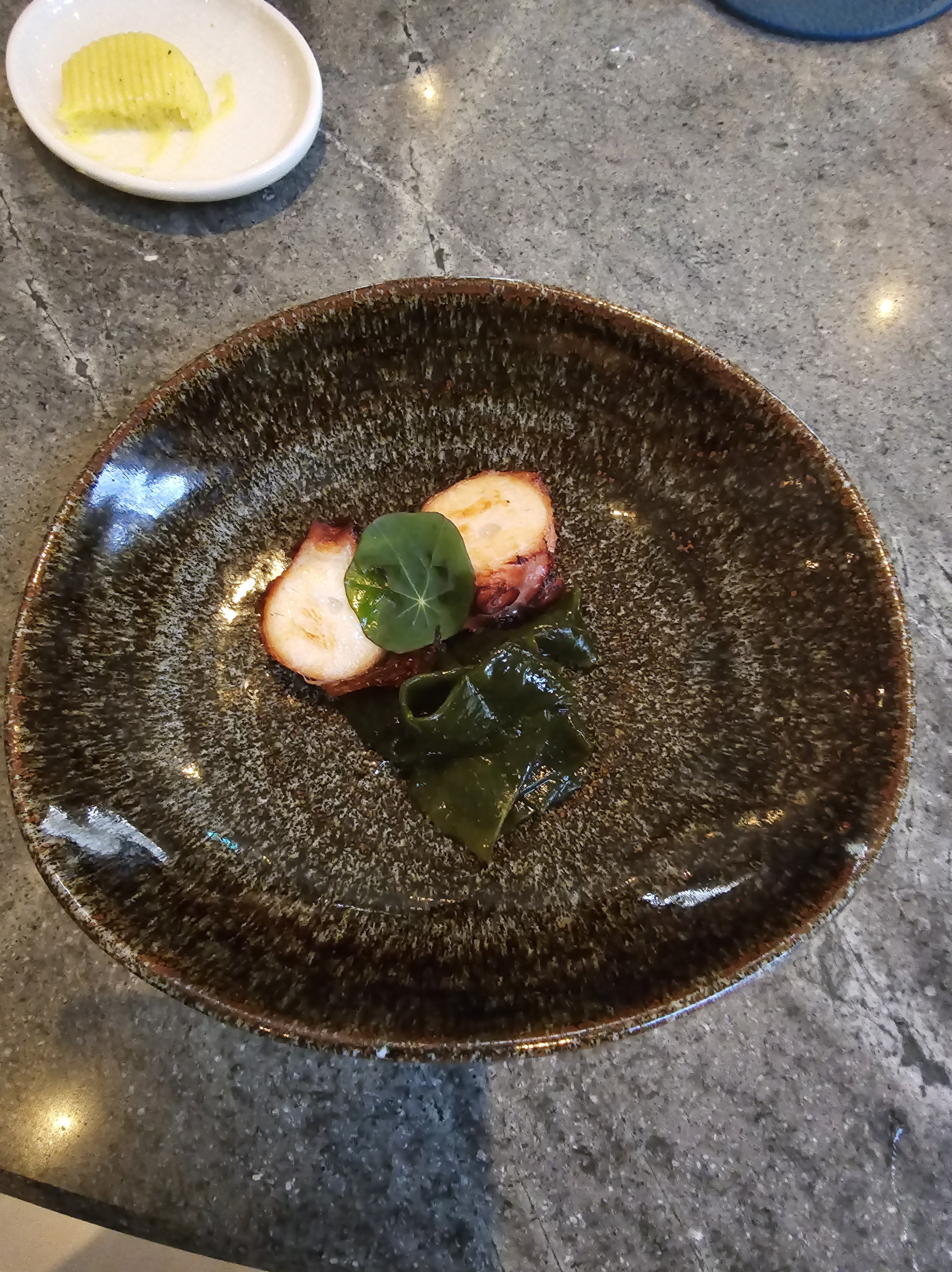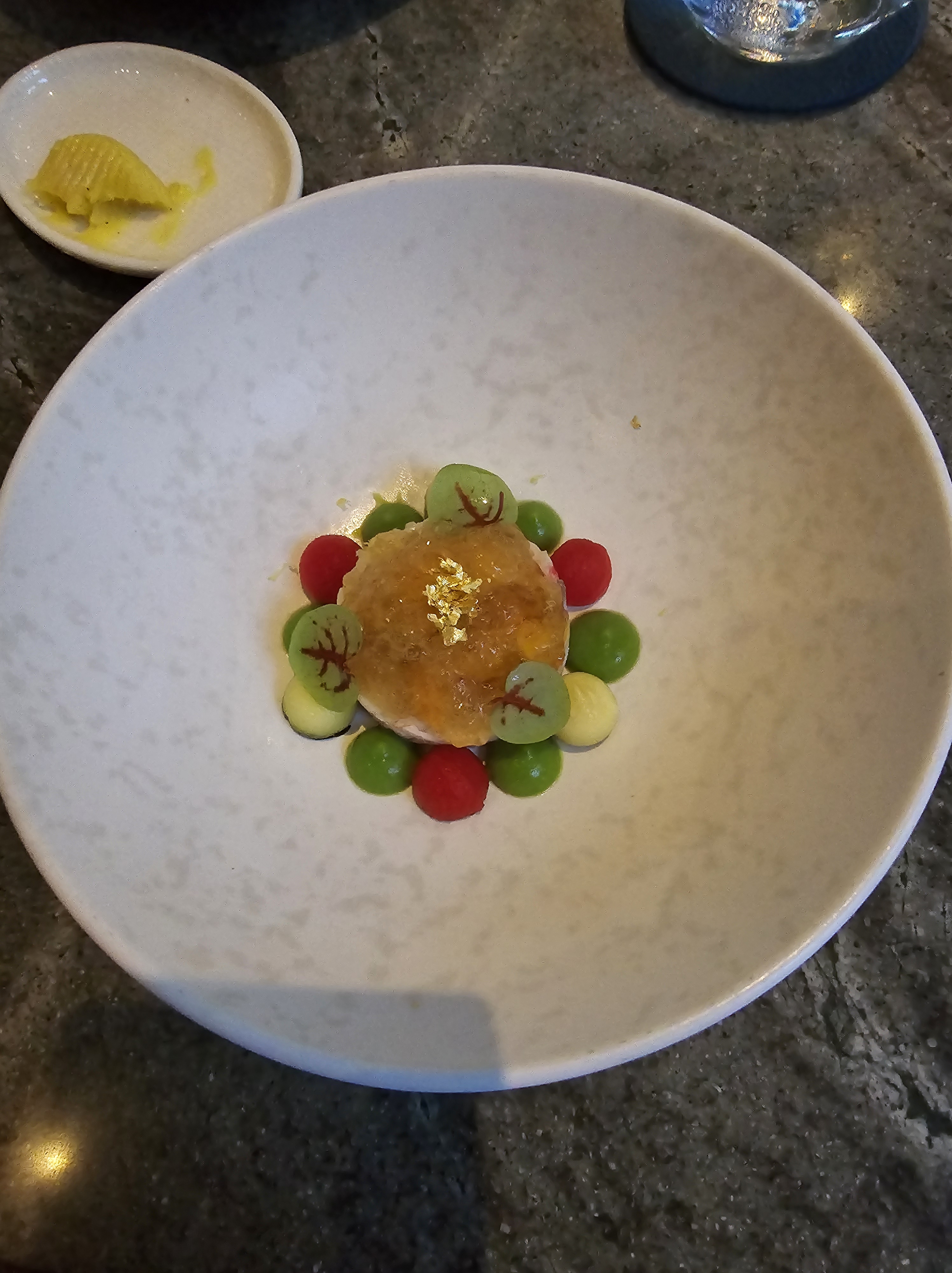 First up we had baby Squid with Yuzu. I’ve never seen Squid that small before, they were no bigger than my little finger. I think they needed to be a little bigger in order to get the full flavour of the Squid, but then that would defeat the object of ‘Baby Squid’. Next I had Octopus which had been slightly fried in order for the suckers to be a little crispy. There was almost a meaty flavour to the Octopus which I didn’t expect. Following the Octopus was the King Crab with a Chicken broth jelly. I didn’t really like the jelly. There was too much of it and it reminded me of the bits of jelly around Corned Beef once you take it out of the tin. The dish however, looked beautiful with the vibrant red Beetroot against the green Peas.