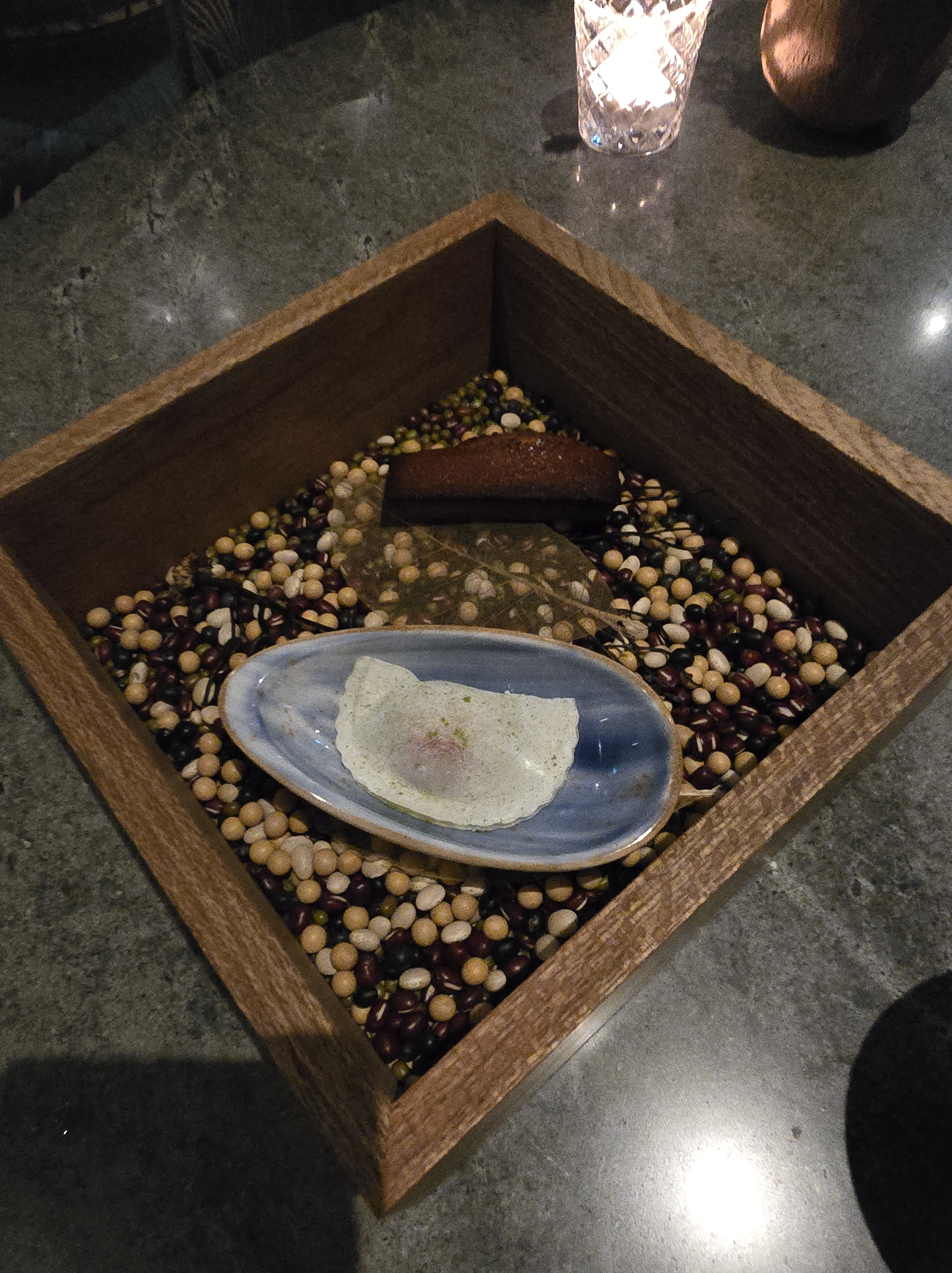 Upon being seated at the restaurant, a little dish with a white pebble appeared. Water was poured over the pebble and it suddenly grew to the size of a Marshmallow. Was I supposed to eat this? Was I not? Was it some kind of Heston Blumenthal-esque canape? I looked around the room and saw fellow patrons had left theirs in the dish. There mine stayed too until I was sure what to do with it. 2 leather bound menus, the smaller contained the dinner menu, a choice of either the 5 or 8 course tasting menu. The larger menu containing the drinks list, a mixture of soft drinks, spirits, wines and cocktails. I opted for a purple punch mocktail and the 8 course tasting menu.