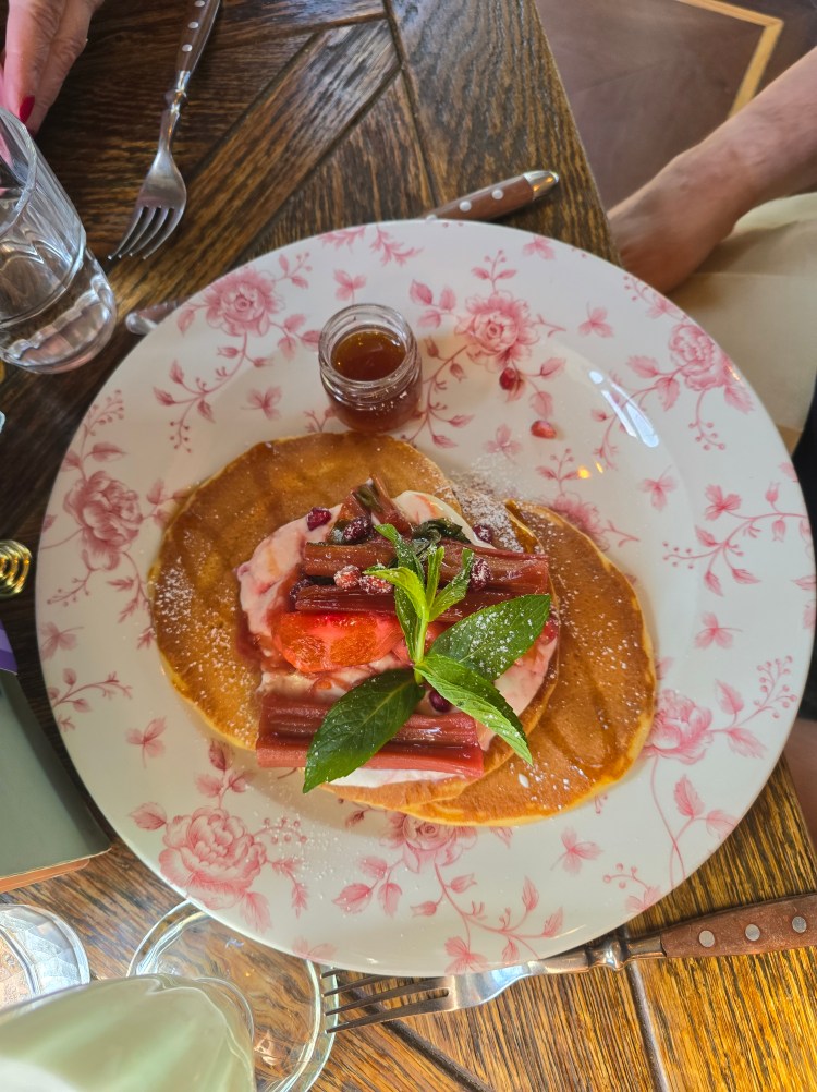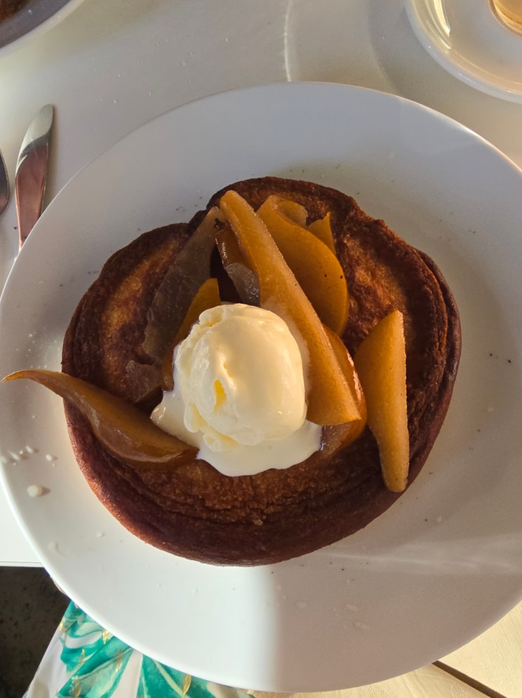 We have a tradition when we arrive in Sydney. After checking into the hotel, we always head across to the Café across the street for our first meal in the city. It had only just opened by the time we walked through the doors at 8am. After being given menus and informed about the specials, we were given a little time to decide. I settled on pancakes with pears and yoghurt sorbet. Expecting 3 small pancakes, imagine my surprise when 3 pancakes almost the size of the plate turned up with quarters of spicy pears adorning the top, finished with the sorbet. Subtly sweet spicy pears and the palette cleansing sorbet. I didn’t manage to finish the pancakes but ate every single piece of pear. Heaven.