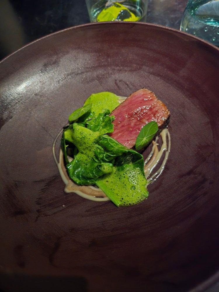 Melbourne was the final stop on the trip for 1 reason, Vue de Monde, another 3 hatted restaurant on the bucket list. We recognised the restaurant immediately as it has featured a few times on MasterChef Australia. Once owned by Chef Shannon Bennett, now with Hugh Allen at the helm, the restaurant had gone through an extensive and expensive renovation in 2024 but luckily reopened in time for us to make reservations for Mum and Dad’s Wedding Anniversary. A small part of the renovation was new chairs, made from Kangaroo fur. There was also Kangaroo on the menu and I felt a little guilty as only a week before I was at Australia Zoo feeding Skippy. Now Skippy was feeding me!